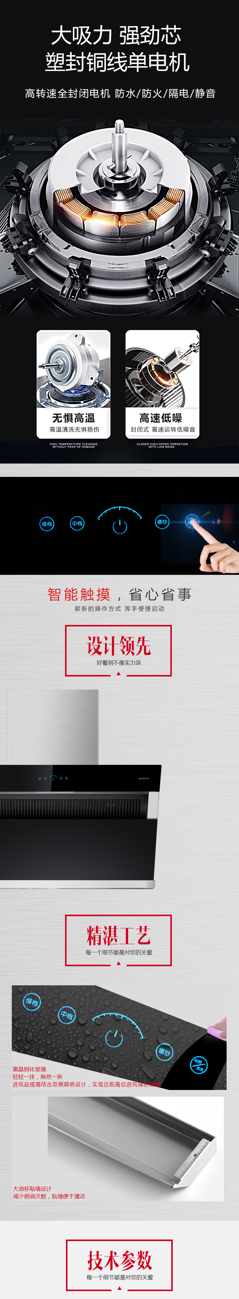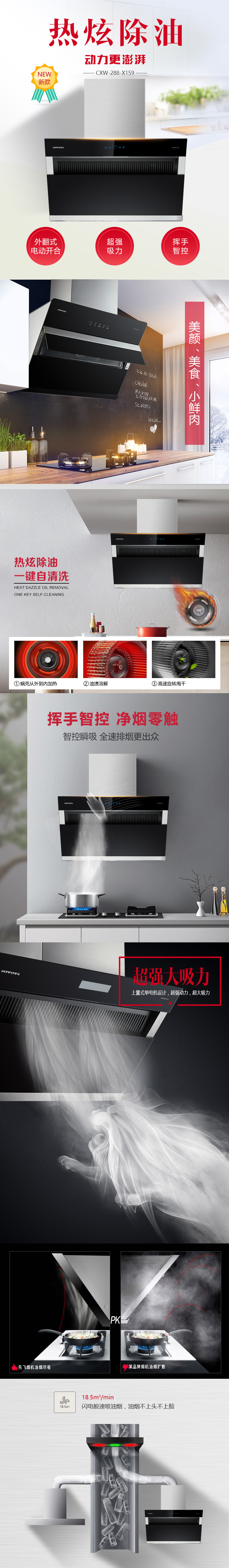 熱炫除油 一鍵自清洗 爆炒大吸力 超強吸油動力 揮手智控 凈煙零觸 黑晶玻璃 輕輕一抹 煥然一新 大油杯貼墻設計 閃電般速吸油煙 18.5m3/min