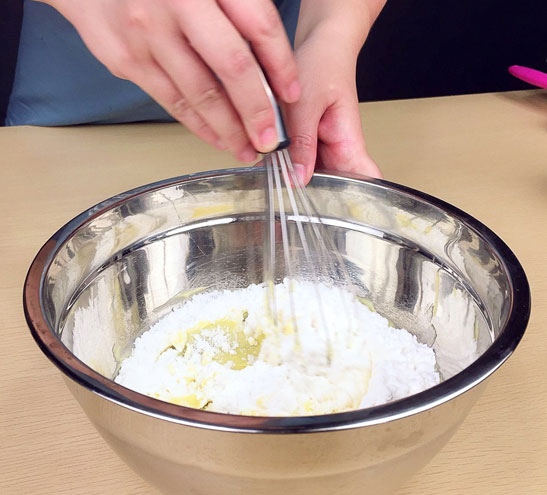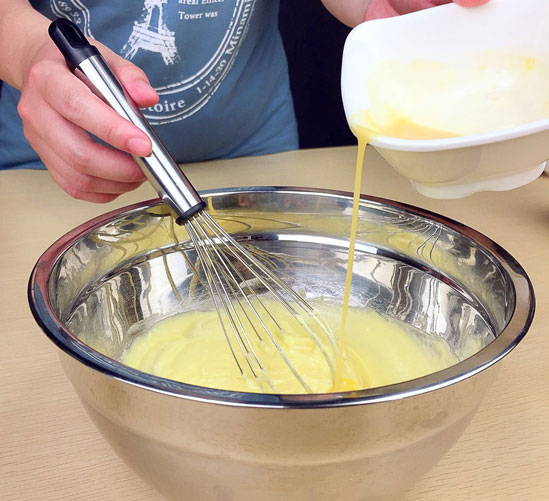 2.將雞蛋液分三次加入,每次加入時要等雞蛋液和黃油充分融合后再加入;(圖2)