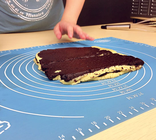 5.將兩種面團(tuán)搟成大小一致的面塊,疊在一起;(圖5)