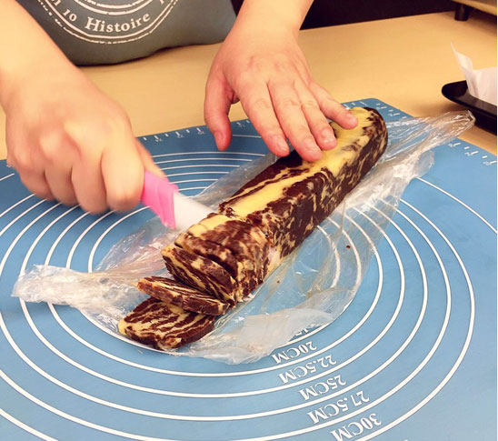 9.包上保鮮膜放入冰箱冷凍至硬后切片;(圖9)