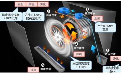 先飛帶“蒸汽清洗”功能的煙機,是以高溫高壓的蒸汽流噴射沖洗渦輪葉片,蒸汽流溫度高度110°,并以0.3MPa的高壓噴射,這就是先飛“蒸汽清洗”煙機能夠徹底洗凈渦輪的核心技術,去污率可達98.5%。