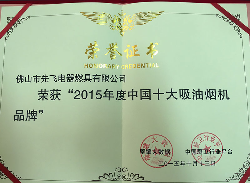 2015年9月20日,中國(guó)廚衛(wèi)行業(yè)平臺(tái)公布了“2015年度十大吸油煙機(jī)品牌”榜單,先飛公司榮獲“2015年度十大吸油煙機(jī)品牌”。