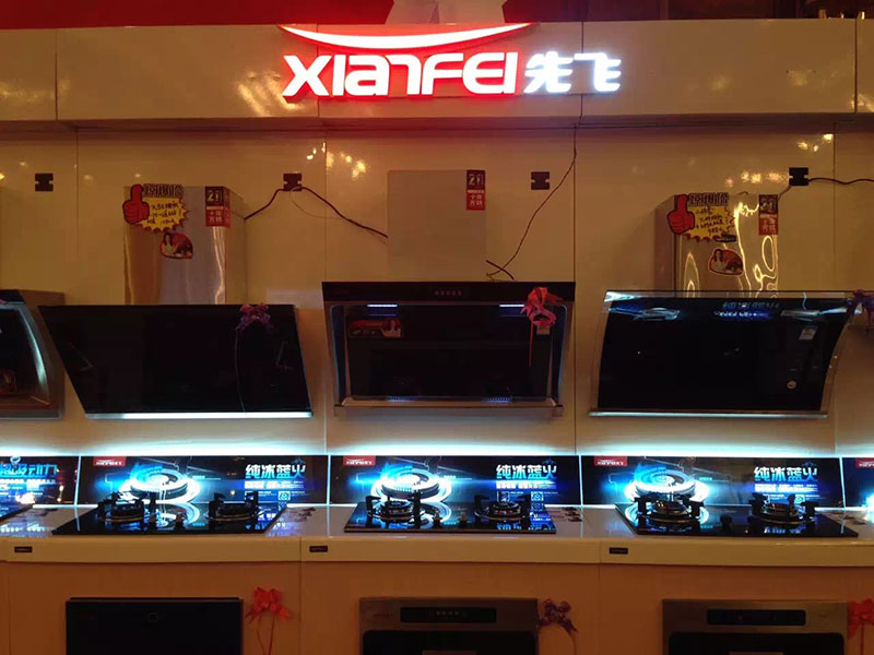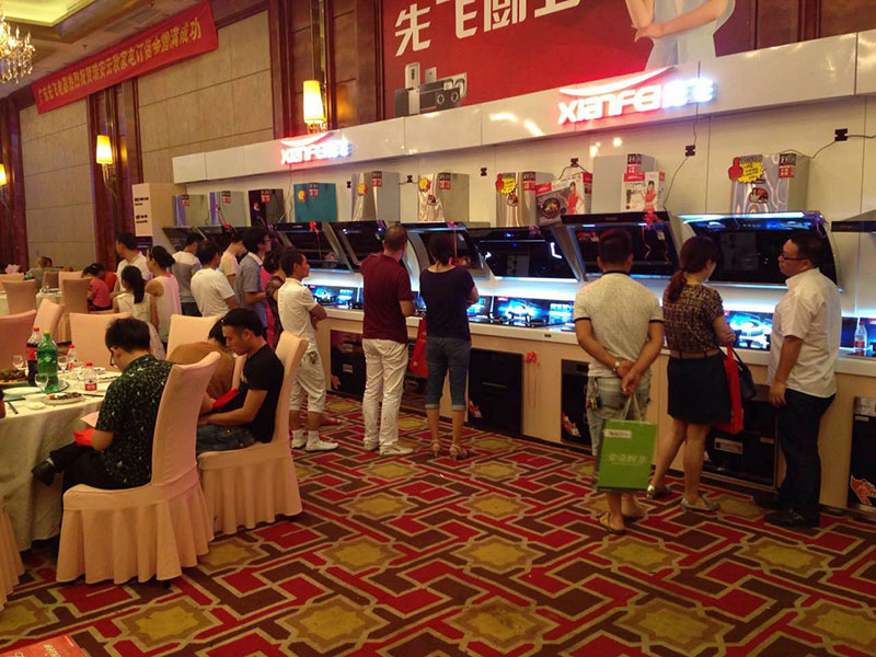先飛超越版展柜閃亮登陸溫州會場,白色烤漆背板,樹脂透光字燈箱,動人心弦高大上!2015年先飛秋季新品“大吸力煙機”系列、凈水器系列、嵌入式烤箱蒸爐產(chǎn)品全線亮相,引發(fā)眾多客戶久久圍觀、選貨與下單吃政策。