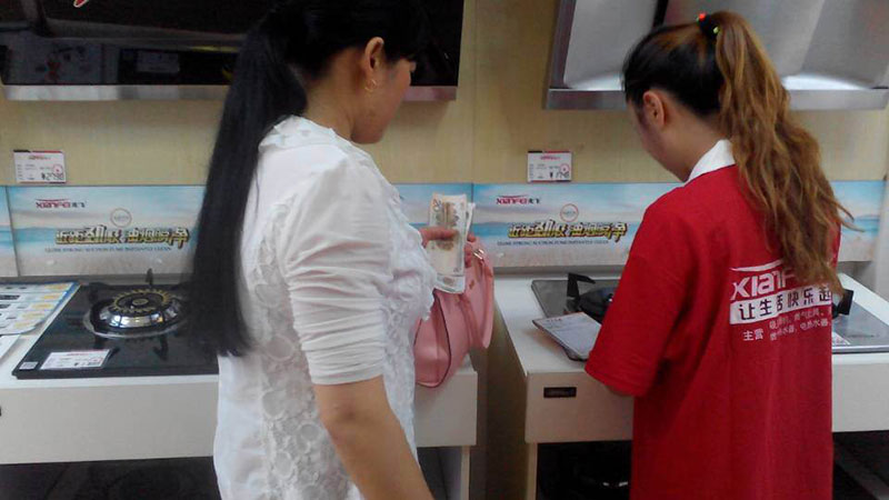 “在這邊來(lái)交錢(qián)吧?”(在成交時(shí)特別提醒銷(xiāo)售員朋友們不要說(shuō)“錢(qián)”這個(gè)字。)