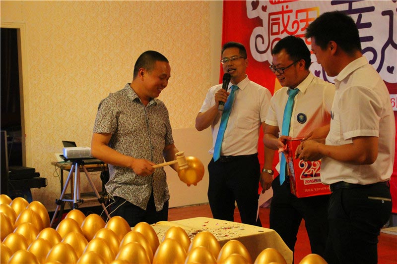 一分耕耘,一分收獲。 只有不斷服務(wù)于人,感恩于人,才會(huì)有更多的收獲!晚宴上,公司對(duì)2015年10位優(yōu)秀銷售人員和10名優(yōu)秀售后人員進(jìn)行表彰!席間,“百分百中獎(jiǎng)”砸金蛋活動(dòng)不時(shí)傳來中大獎(jiǎng)的好消息,嘉賓代表的表演更是將晚會(huì)推向了高潮。一家人齊聚一堂,歡樂不斷!