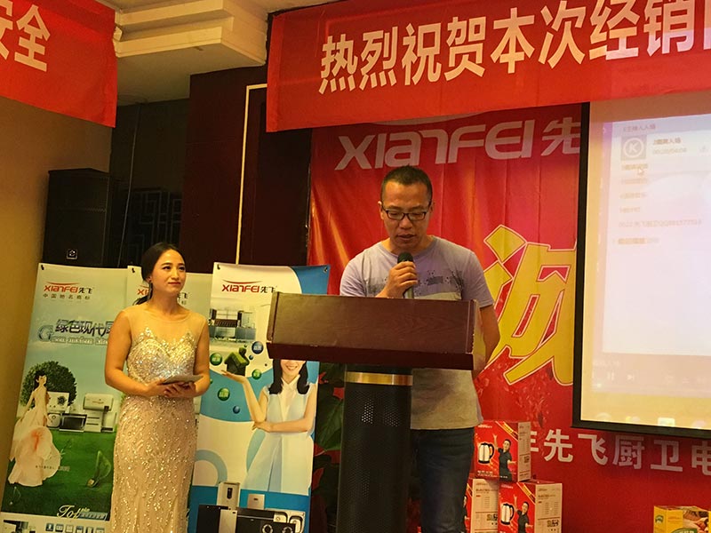 會議現(xiàn)場,首先先飛西北區(qū)域總監(jiān)孟總對參會客戶表示由衷的歡迎!其次,先飛電器全國營銷總監(jiān)聶總,對于廚衛(wèi)行業(yè)、先飛品牌、未來先飛做了深入淺出的講解,不間斷的掌聲也足以證明客戶的共鳴與認(rèn)同!先飛華北區(qū)域總監(jiān)趙總,通過對產(chǎn)品全面細(xì)致的講解,使參會客戶更加堅(jiān)定與先飛合作的信心!