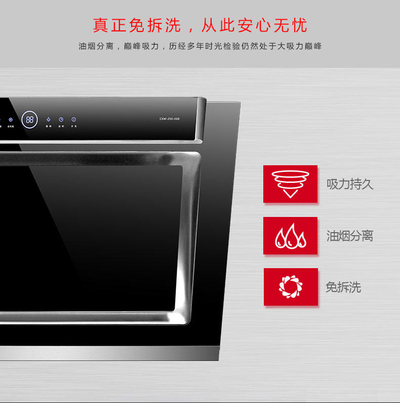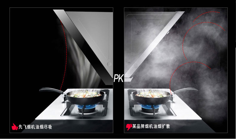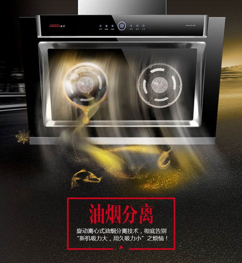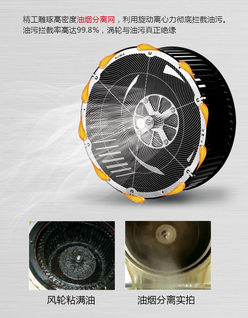相比上一代油網(wǎng)靜態(tài)油煙分離技術(shù),先飛旋動(dòng)離心式油煙分離技術(shù)有著以下幾大顯著優(yōu)勢(shì):①先飛旋動(dòng)離心式油煙分離技術(shù)術(shù)語實(shí)現(xiàn)油煙主動(dòng)分離,油煙分離率更高,可達(dá)99.8%,而上一代油網(wǎng)靜態(tài)油煙分離技術(shù)屬于被動(dòng)分離,油煙分離率普遍較低;②先飛旋動(dòng)離心式油煙分離煙機(jī)吸力可達(dá)到大吸力參數(shù)要求,而上一代油網(wǎng)靜態(tài)油煙分離煙機(jī)吸力普遍較?。虎巯蕊w旋動(dòng)離心式油煙分離煙機(jī)機(jī)型更加美觀大氣時(shí)尚,而上一代油網(wǎng)靜態(tài)油煙分離煙機(jī)基本上是處于市場(chǎng)邊緣化的不銹鋼煙機(jī);④先飛旋動(dòng)離心式油煙分離技術(shù)無需拆洗,沒有售后,而上一代油網(wǎng)靜態(tài)油煙分離煙機(jī)需要經(jīng)常拆洗油網(wǎng)。