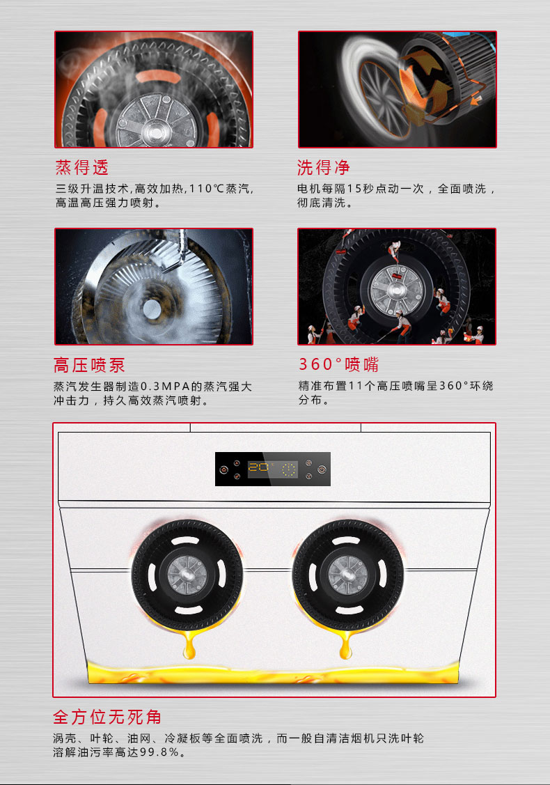 先飛廚衛(wèi)全國(guó)全行業(yè)首推煙機(jī)“大吸力+”戰(zhàn)略,其中先飛煙機(jī)“大吸力+高溫蒸汽洗”就是通過110℃、0.3Mpa的高溫蒸汽強(qiáng)力噴洗煙機(jī)渦輪,噴洗8分鐘,甩干3分鐘,從而有效解決煙機(jī)吸力衰減等問題。不僅讓新買煙機(jī)保持大吸力,而且在使用三年、五年、八年之久仍然處于吸力巔峰,仍然是大吸力,可見先飛煙機(jī)“大吸力+”戰(zhàn)略與其他品牌大吸力有著本質(zhì)不同!