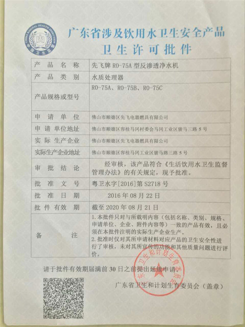 先飛公司提示您:購買凈水機一定要關(guān)注兩大批件:一是凈水器檢測報告,二是涉水產(chǎn)品衛(wèi)生批文,也常簡稱為“涉水批文“、”水批”。所謂涉水產(chǎn)品衛(wèi)生批文,是由省衛(wèi)生與計劃生育委員會認證頒發(fā),從凈水器機器質(zhì)量到出水品質(zhì)都已經(jīng)全方位檢驗合格并許可上市銷售。