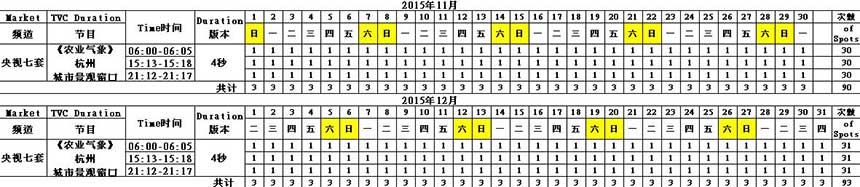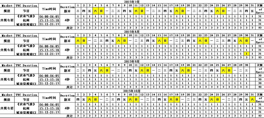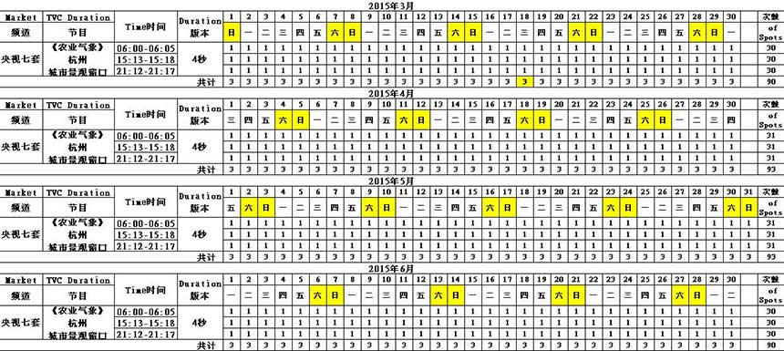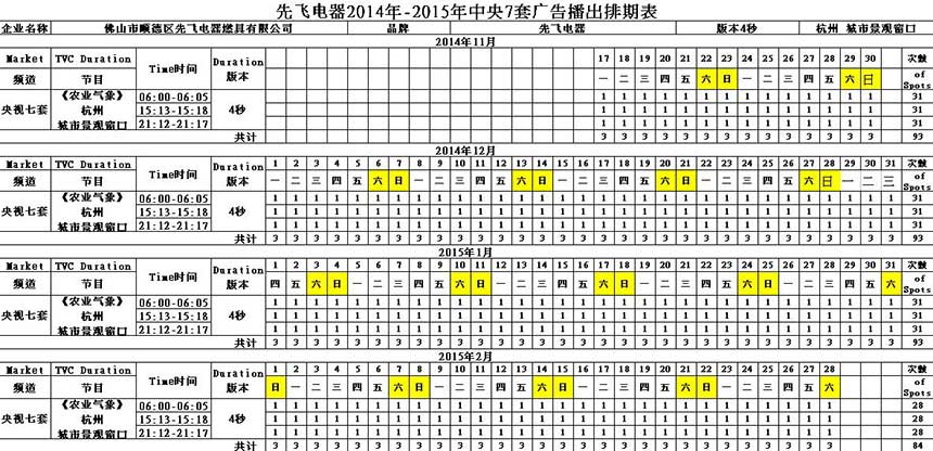 2015年先飛公司將在CCTV-7央視頻道《農(nóng)業(yè)氣象》天氣預(yù)報之“杭州”城市板塊植入廣告,廣告時間為2014年11月17日至2015年12月31日,每天三次(06:00-06:05;15:13-15:18;21:12-21:17),詳細(xì)排期情況請上公司官網(wǎng)(http://m.6sx5sh.cn/)查看《先飛電器2015年中央電視臺廣告播出排期表》。
