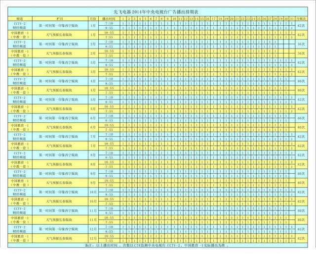 2014年1月1日-12月31日期間,先飛公司在全國權(quán)威電視媒體CCTV-2、CETV-1投放全年電視廣告,這是以城市居民、工薪階層、白領(lǐng)、老板等為主要目標(biāo)受眾,有效提升了先飛品牌在全國大、中、小城市的曝光率與知名度,積極推動了先飛產(chǎn)品在全國各區(qū)域市場的上柜率與銷售額。