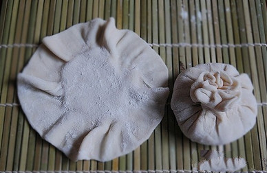 4.面團(tuán)揉勻后分成15g重的小劑子,搟成面皮,在每個(gè)面皮中放入約50g餡,包成口部張開呈花狀的燒賣。(圖4)
