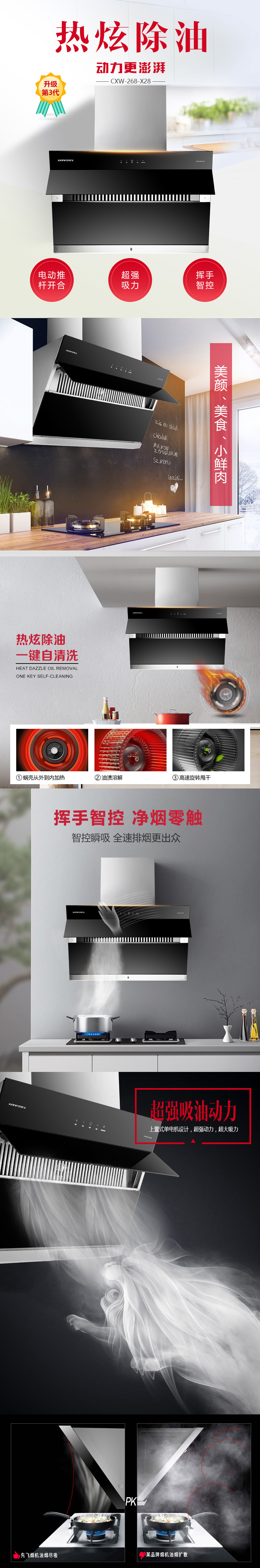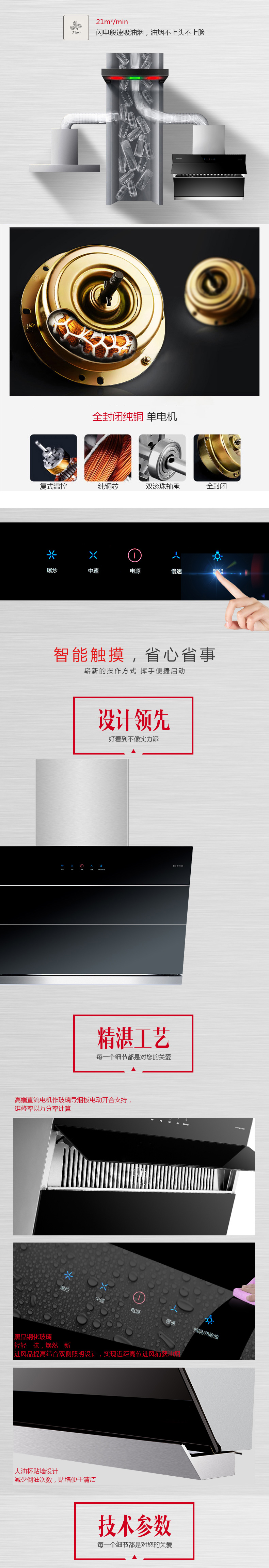 熱炫除油 一鍵自清洗 超強(qiáng)吸油動力 揮手智控 凈煙零觸 電動推桿開合 反轉(zhuǎn)深吸進(jìn)風(fēng)網(wǎng)設(shè)計 黑晶玻璃 輕輕一抹 煥然一新 大油杯貼墻設(shè)計 閃電般速吸油煙 21m3/min